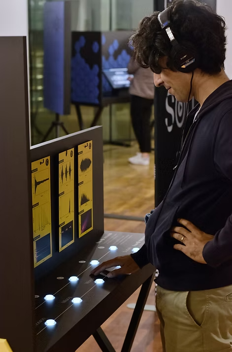 Les dispositifs interactifs reprennent les codes des instruments numériques actuels : touches rétroéclairées, pads inspirés des interfaces musicales, interfaces évoquant les panneaux de contrôle audio.