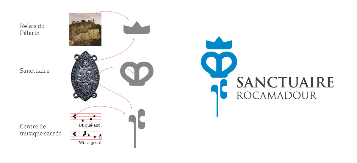 Conception d’une nouvelle identité visuelle pour le Sanctuaire de Rocamadour, laquelle rendra compte des trois émanations du centre religieux : le sanctuaire, le relais des pèlerins et le centre de musique sacrée.